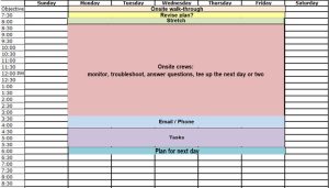 This is an example of time blocking for employees of a construction company who work at the job sites. A good portion of the work day is spent on collaborating with various crews who are assigned to that site on that day.