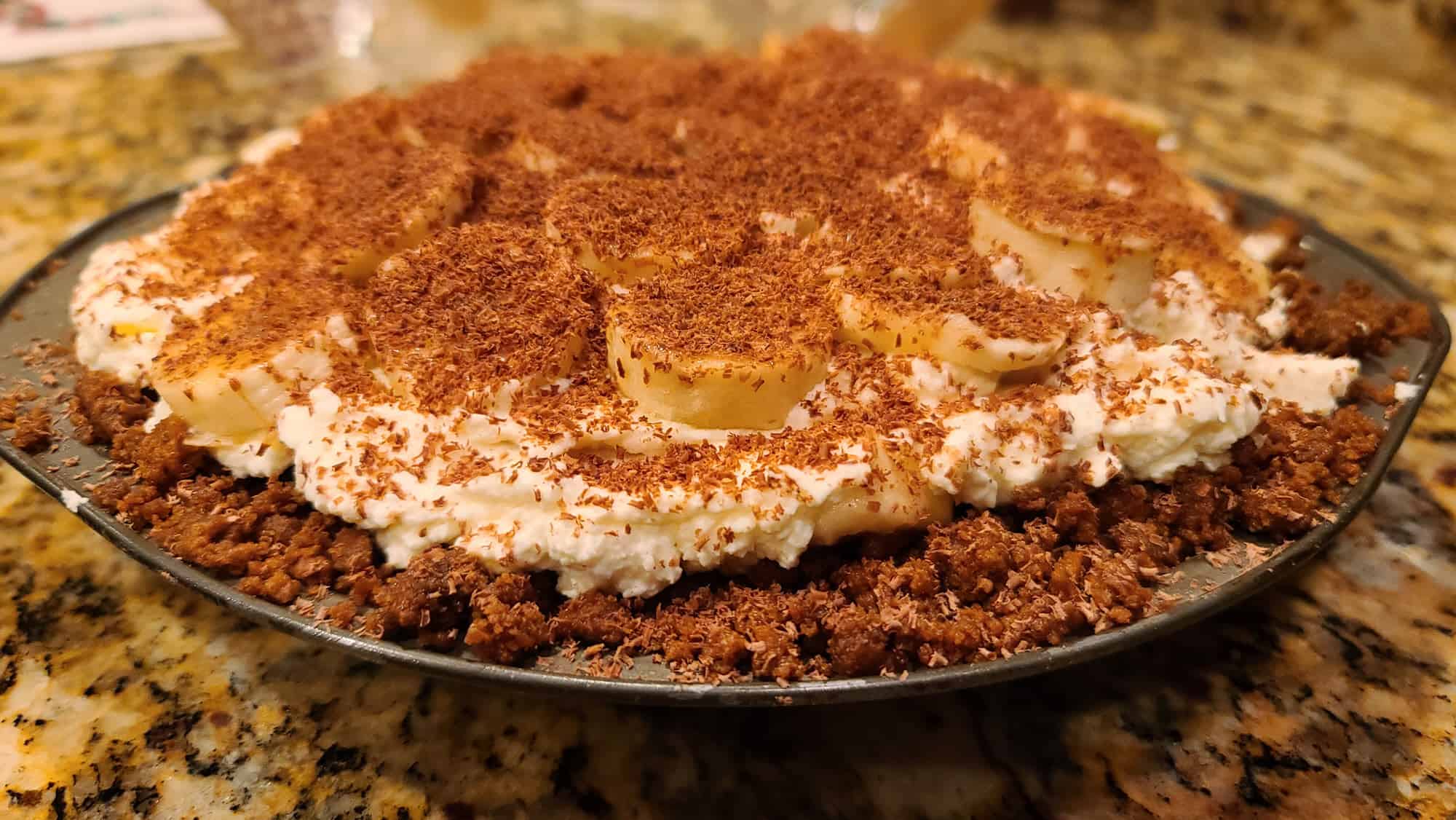 Ingredients 3 sticks of butter 9 oz ginger snaps (crushed) ¾ cup sugar 14 oz can of condensed milk 4 bananas (sliced) 1 lemon (juiced) 1 cup double or whipping cream grated chocolate Directions Crush the ginger snaps into fine crumbs. In a saucepan, melt 10 TB (1 stick + 2…